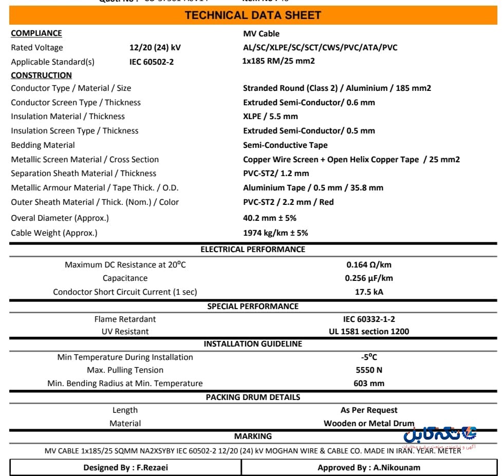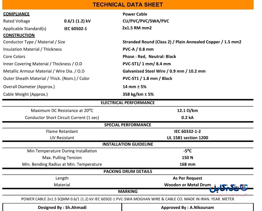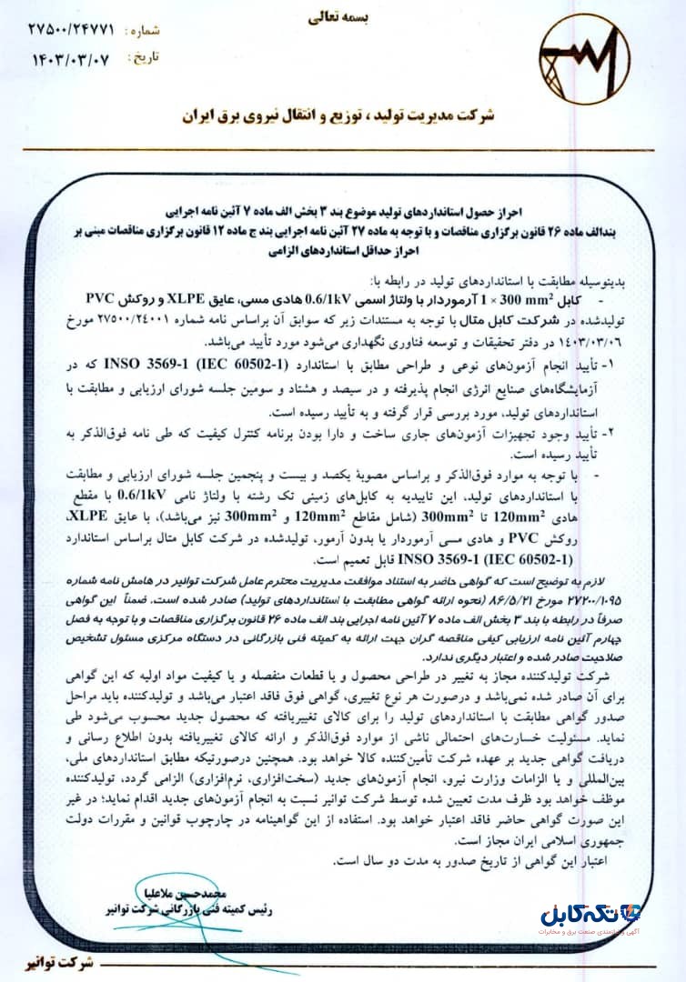 تایید توانیر کابل ۳۰۰ آرموردار شرکت متال